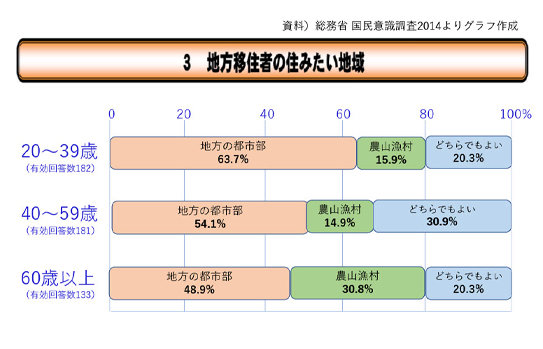 ひと口に「田舎」「地方」といっても場所によって気候、風景、特徴はさまざまです。総務省が公表した「国民意識調査」によると、下グラフのとおり、20〜39歳の63.7%が「地方の都市部」への移住を希望する結果に。この数字の背景には、「やっぱり、大型のショッピングモールや飲食店、店舗などが立ち並ぶ都市部が便利」という考えが窺えますね。