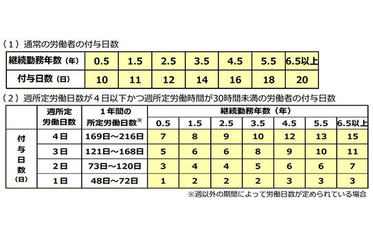 また、派遣社員の場合は、1週間の労働日数が4日以下になることもあるでしょう。そうした働き方のケースでも、継続勤務年数(日数)と1週間の所定労働日数(1年間の所定労働日数)が減るごとに、付与される日数が少なくなっていきます(下記図表の(2)参照)。