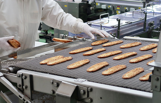 ベルトコンベアーで流れてきた食材を、調理前に加工する工程です。たとえば、次々と流れてくるパン生地に卵やバターを塗ったり、食材に下味やパン粉を付けたりします。