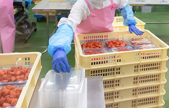 生鮮食品工場で扱う商品は、スーパーに並ぶ精肉・鮮魚やカット野菜などが中心となるため、食材の洗浄・下処理・切り分け・パッキングなどの行程が中心となります。工場によっては牛・豚や大型魚の解体など、専門的な技術を要する作業もあります。 また、生鮮品の品質を維持するため、工場内の室温は低めに設定されており、扱う食材によっては冷凍・冷蔵倉庫内で作業することもあります。