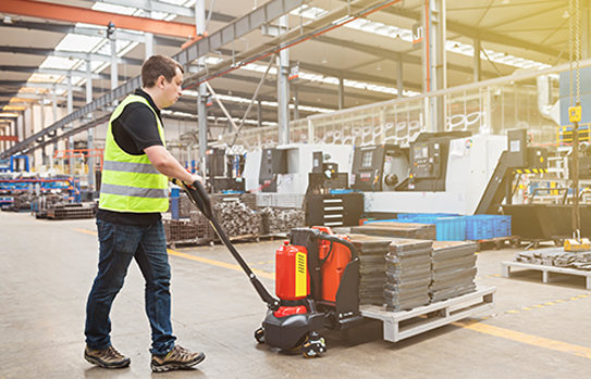 オペレーターが歩いて操縦する、歩行操作式のコンパクトなフォークリフト。他のフォークリフトが入れない狭い場所での作業に適しており、細い通路の走行やエレベーターでの移動も可能。階層によって作業が異なる現場の荷物移動や、倉庫内でのピッキング作業などにも使われています。