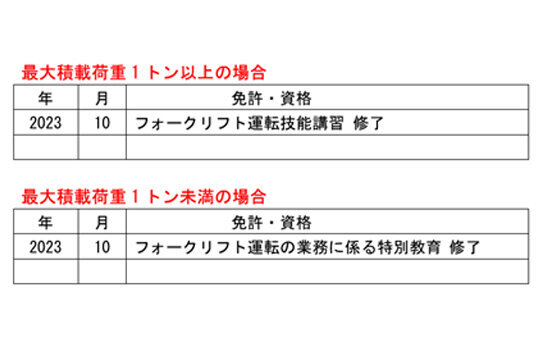 したがって、履歴書の免許・資格欄には、取得年月とともに「フォークリフト運転技能講習 修了」「フォークリフト運転の業務に係る特別教育 修了」と記載します(以下参照)。