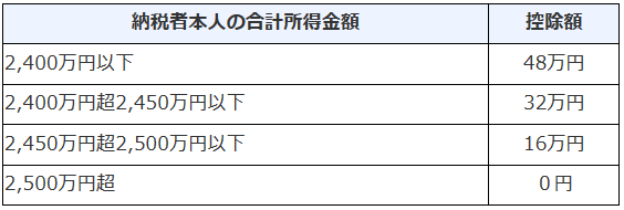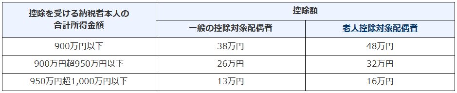 配偶者控除とは、配偶者(夫や妻)のいる人が利用できる控除です。控除を受ける納税者の年収が1000万円以下で、配偶者の年収が年間48万円以下(給与のみの場合は103万円以下)であれば控除を受けられます。控除額は、控除を受ける納税者の年収によって異なります(以下参照 ※)。
