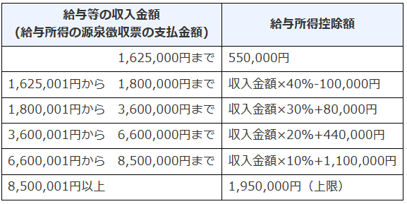 給与所得控除とは、勤務先から給料をもらっている人が利用できる控除です。控除額は納税者の年収によって異なります(以下参照 ※)。
