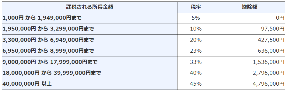 所得税とは1年間の所得に対して一定の税率を課す税金で、年収(年間の総所得金額)が103万円を超えた場合はフリーターも課税対象になります。年収から各種控除を差し引いた金額(課税対象となる金額)に、規定の税率をかけて算出するため、収入が多くなるほど納付する所得税は高くなります(以下参照 ※)。