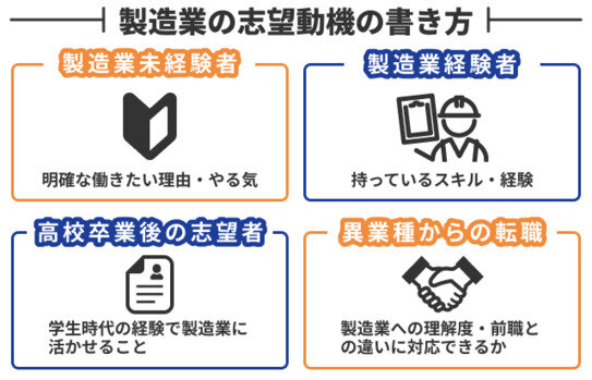 他業種から製造業への転職をする際の志望動機には「製造業への理解度」と「前職との違いに対応できるか」を志望動機に書くと好印象に繋がります。前職の経験の中で製造業の業務に対してプラスに働くものがあれば記入した方が良いでしょう。