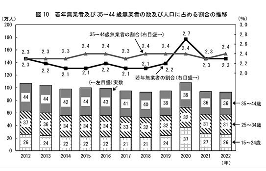 ただ、15~24歳、25~34歳、35~44歳ごとの無業者数を比べると、年齢層が高くなるほど多くなり、就業が難しくなることを示しています(下記グラフ参照)。