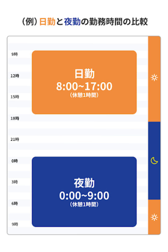 日勤の勤務時間は「8時~17時」「9時~18時」「8時~20時」「9時~21時」など、職場や業種によってさまざまなパターンがあり、休憩時間を除いた実労時間は8時間~12時間程度となるのが一般的です。