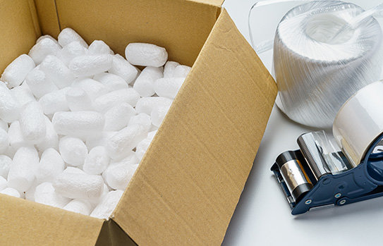 梱包材の中で製品が動いて破損しないよう、エアパッキンなどの緩衝材を詰めてしっかりと保護します。とくに破損しやすい製品は、品物自体を緩衝材で包んでから梱包材に入れ、さらに緩衝材を詰めて念入りに保護します。