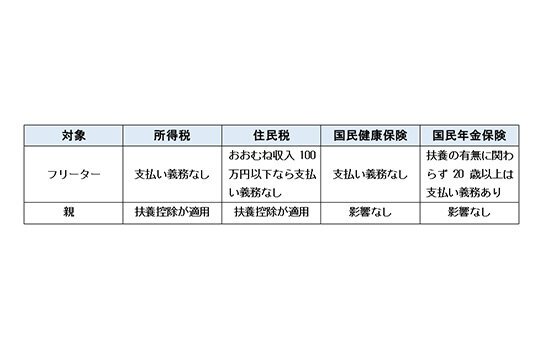 親に扶養されているフリーターの場合、年収が制度適用内に収まっていれば、税金や保険料を自分で支払う必要はありません。また、扶養者である親も税金の控除が受けられます。