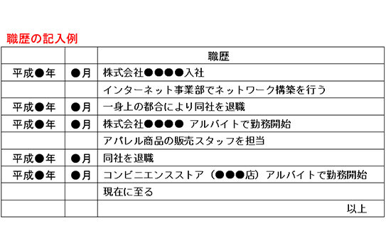応募職種に近いアルバイトを中心に書くようにしますが、それだけだと空白期間があるように見えてしまいます。入社・退職や、似た職種を1行にまとめて書くなど、ほかの職種の職歴も簡単に補足しておくといいでしょう。