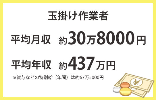 厚生労働省の「賃金構造基本統計調査」によると、玉掛け作業者の平均給与(月間)は約30万8000円、賞与などの特別給(年間)は約67万5000円で、平均年収を算出すると約437万円となります。