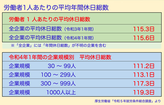 日本の全企業の年間平均休日数(令和4年)は、115.6日