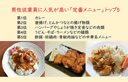 ちなみに男性従業員に人気が高い“工場食堂”の定番メニューのトップ5は下のとおり。きっと、みなさんが好きなものばかりなのでは。