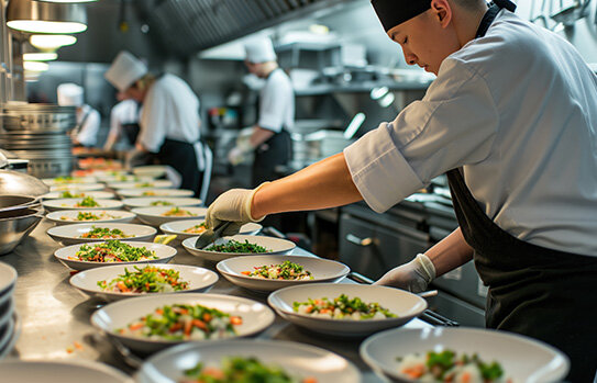 “工場食堂”の運営は一般的に専門業者に委託することが多く、委託業者は病院・社会福祉施設や教育機関、スポーツ施設などの幅広い分野でフードサービスを受託しています。そうした業者から派遣されるスタッフや調理人は、有名ホテルやレストランで長年経験を積んだ人や社内研修を受けた人が多いため、数百人分から数千人の料理を大鍋で手際よく衛生的に調理し、ベストなタイミングでサーブするコツを熟知してします。