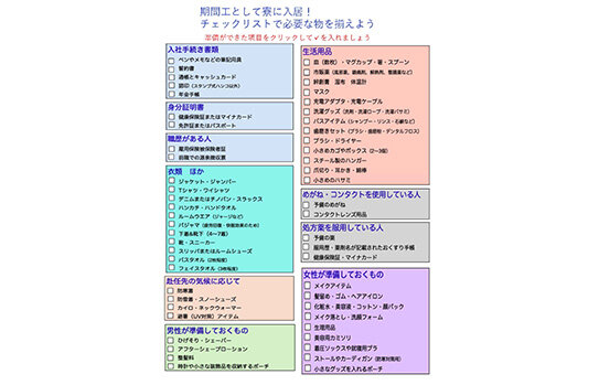 今回は、期間工として新たな一歩を踏み出そうとする人向けに「“準備①”入社手続きに必要な書類」「“準備②”必ず用意したい新生活に必要なもの」「“準備③”男性、女性・個人別 新生活に必要なもの」「“準備④”準備段階で“注意”すべきこと」「“準備⑤”あると“便利”なもの」の5つのポイントに分けてご紹介します。