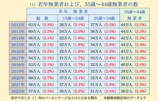 上表(1)を見ると、2012年以降「15歳〜24歳若年無業者数は1%台後半から2%前半」「25歳〜34歳の若年無業者数2.4%〜2.5%」「35歳〜44歳の無業者数は2.3%〜2.4%」で推移しています。
