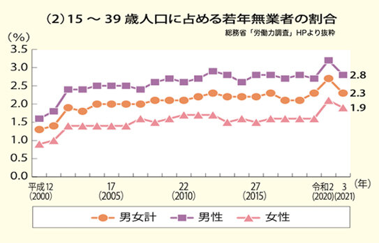 なかでも大きな変化は、コロナ禍が始まった2020年に15歳〜24歳の無業者が一気に37万人へと増加した点にあります。この変化は、新型コロナウイルスの蔓延によって学校が休校になった、もしくは、飲食店やサービス業が休業に追い込まれたことで、アルバイト(非正規雇用)として働いていた若者が仕事をなくしたことが要因として考えられ、その後の2021年(2.3%)、2022年(2.2%)も高い数値で推移しています。