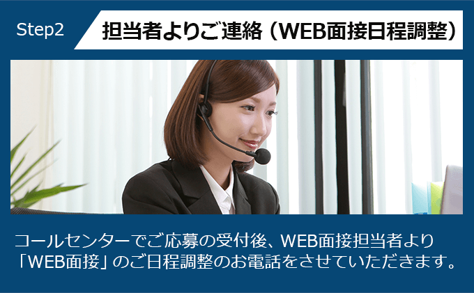 コールセンターでご応募の受付後、WEB面接担当者よりWEB面接のご日程調整のお電話をさせていただきます。