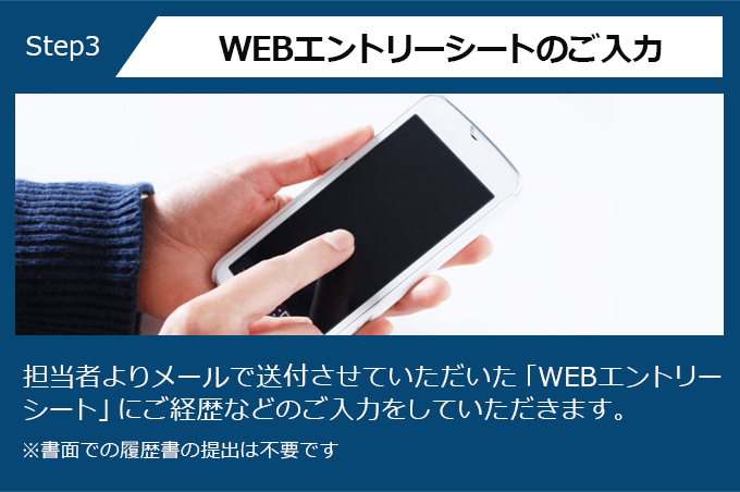 担当者よりメールで送付させていただいた「WEBエントリーシート」にご経歴などのご入力をしていただきます。