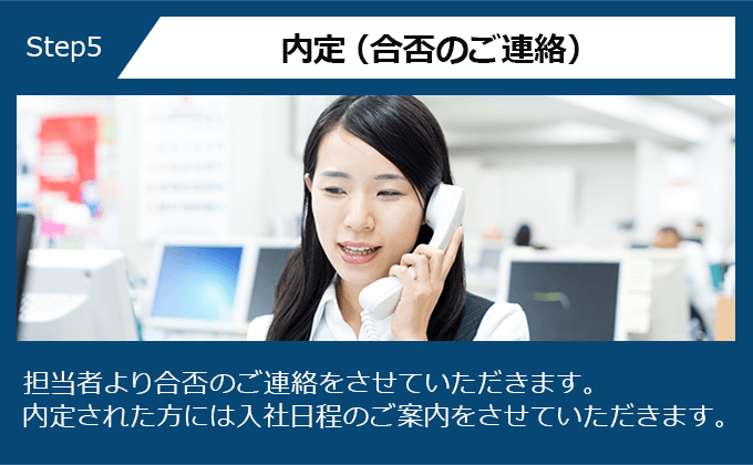担当者より合否のご連絡をさせていただきます。内定された方には入社日程のご案内をさせていただきます。