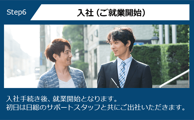 入社手続き後、就業開始となります。初日は日総のサポートスタッフと共にご出社いただきます。